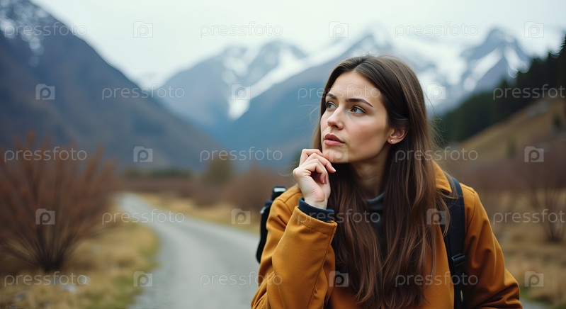 Молодая женщина размышляет во время прогулки по горному пейзажу
