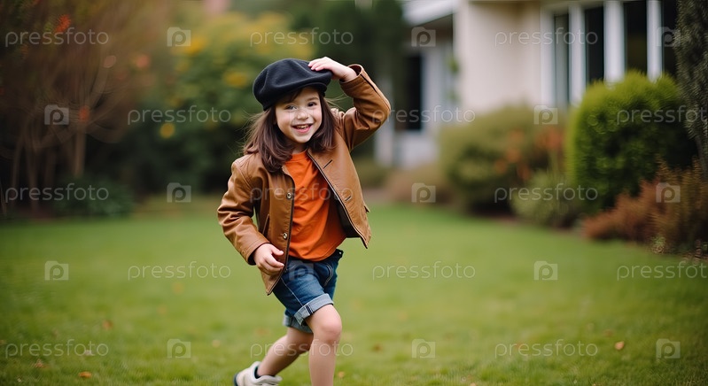 Девочка бегает на открытом воздухе, улыбается и держит шляпу в саду