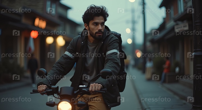 Молодой взрослый мужчина едет на мотоцикле по городской улице в рассвете
