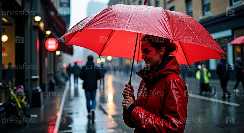 Молодая взрослая женщина ходит под зонтиком во время дождливого городского вечера