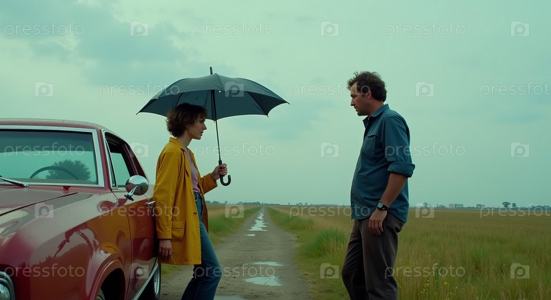Молодая женщина держит зонтик и разговаривает с мужчиной среднего возраста