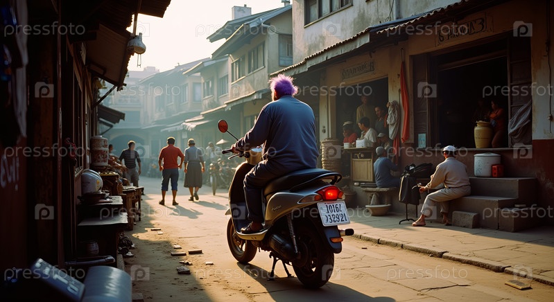 Мужчина среднего возраста едет на скутере через оживленный городской уличный рынок