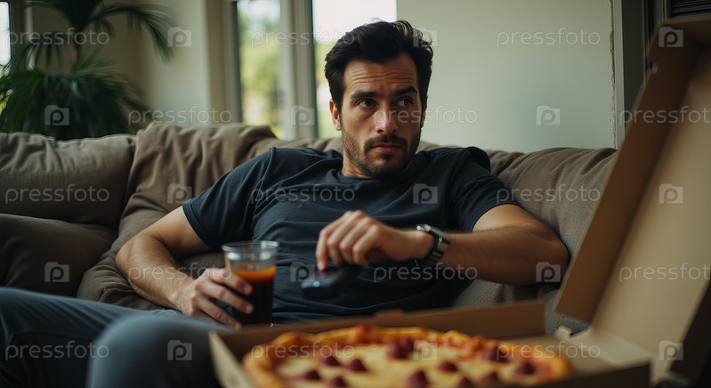 Молодой взрослый мужчина отдыхает на диване смотрит телевизор ест пиццу