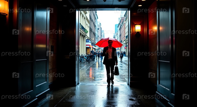 Молодая взрослая женщина ходит с зонтиком на дождливой городской улице