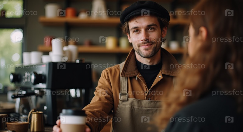 Молодой человек подает кофе клиенту в современном кафе