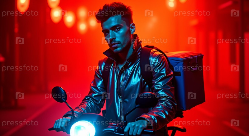 Портрет молодого взрослого испаноязычного мужчины, доставляющего еду на скутере ночью