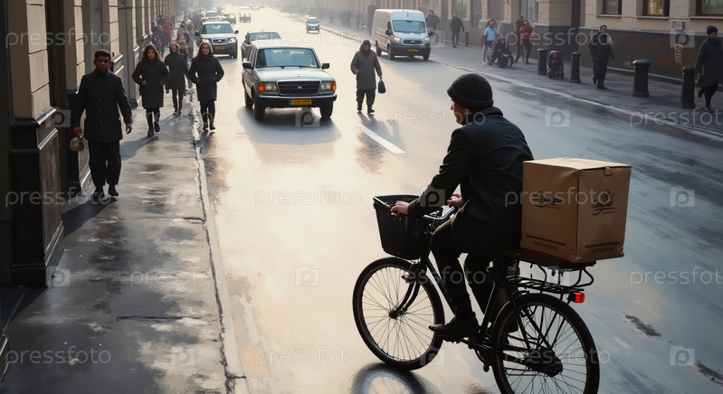 Мужчина среднего возраста едет на велосипеде по городской улице, доставляя пакет