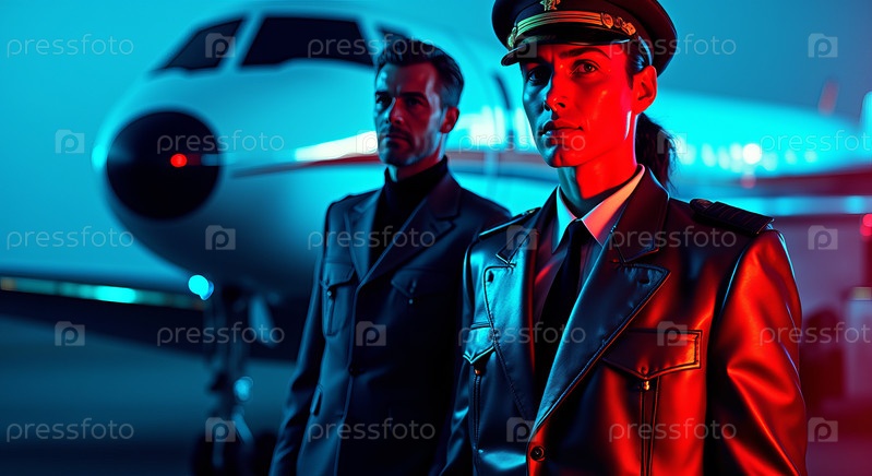 Женщина-пилот стоит с коллегой-мужчиной возле частного самолета