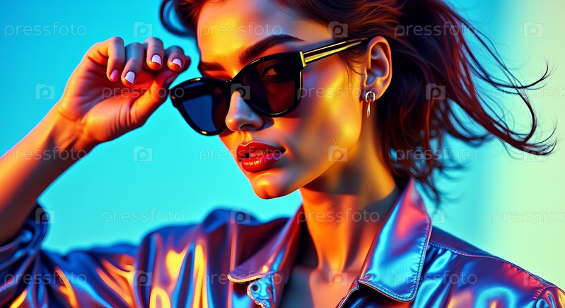Портрет молодой взрослой женщины, регулирующей солнцезащитные очки в студии