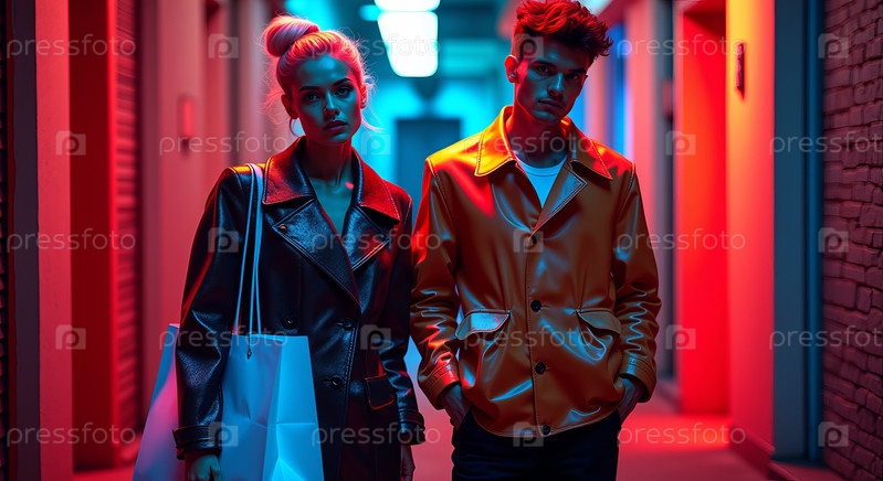 Молодая женщина и молодой человек ходят в освещенном неоном коридоре