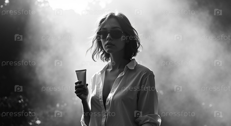 Портрет молодой взрослой женщины в солнцезащитных очках, держащей косметическую трубку