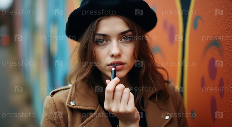 Портрет молодой женщины, наносящей помаду возле городской стены граффити