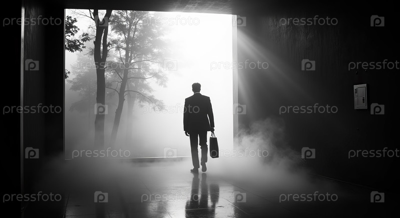 Человек среднего возраста, идущий по туманному коридору к ярким открытым местам