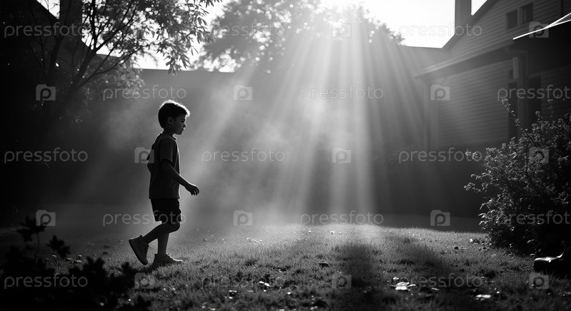 Мальчик, гуляющий по солнечному саду в раннем утреннем тумане на открытом воздухе