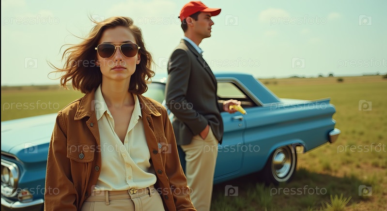 Молодая женщина уверенно стоит рядом с молодым человеком на открытом воздухе