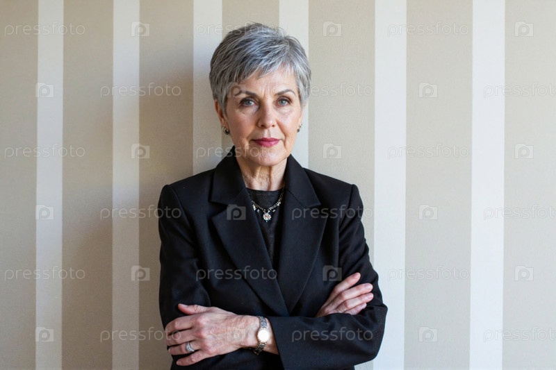 Портрет пожилой женщины, стоящей с перекрещенными руками в помещении