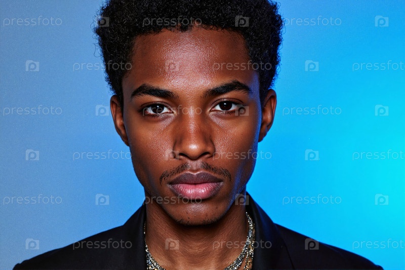 Портрет молодого взрослого чернокожего мужчины, пристально глядящего на синий фон