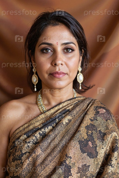 Портрет южноазиатской женщины среднего возраста, одетой в украшения и смотрящей на камеру