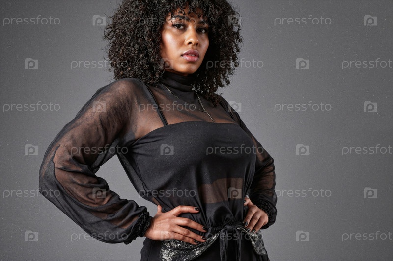 Портрет молодой взрослой чернокожей женщины, позирующей уверенно с руками на бедрах