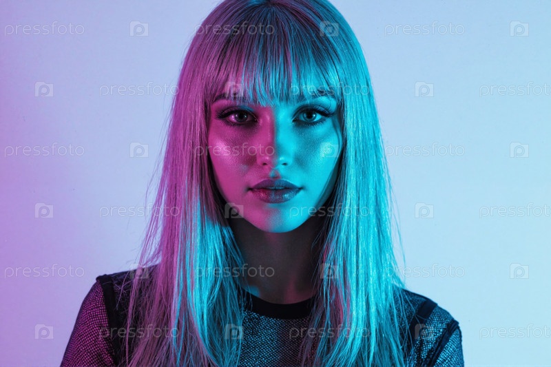 Портрет молодой взрослой женщины, глядящей в камеру под неоновым освещением