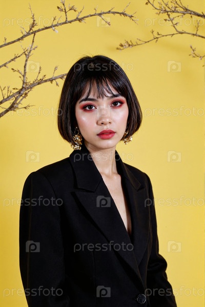 Портрет молодой взрослой азиатской женщины, носящей серьги и позирующей на желтом фоне