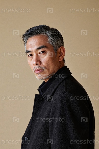 Портрет средневекового азиатского мужчины, смотрящего через плечо на простом фоне
