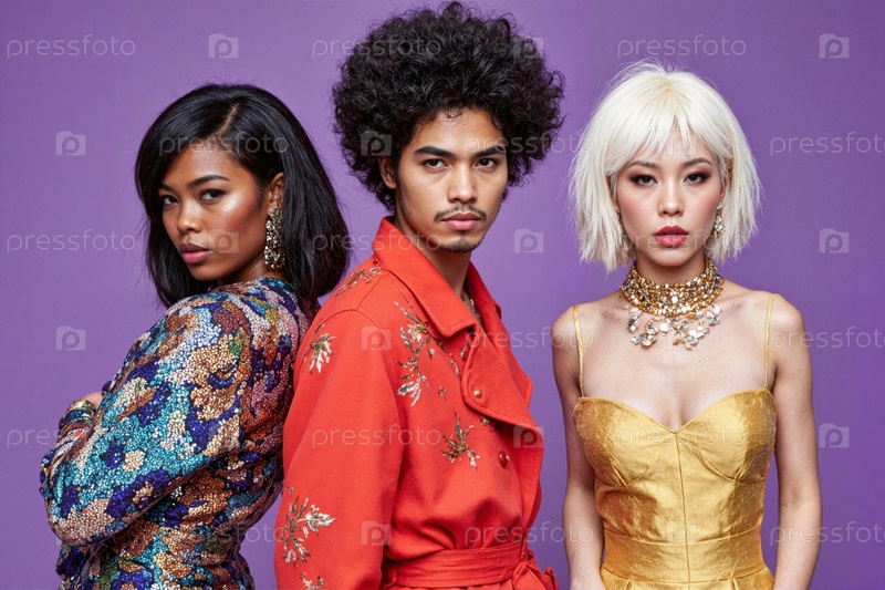 Мультиэтнические молодые взрослые позируют уверенно на фоне Purple Studio Background