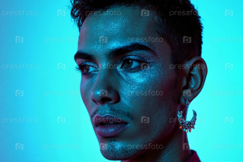 Портрет молодого взрослого мужчины, носящего серьгу под синим светом