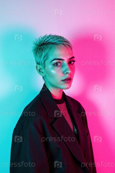 Портрет молодой взрослой женщины, стоящей под красочным неоновым освещением