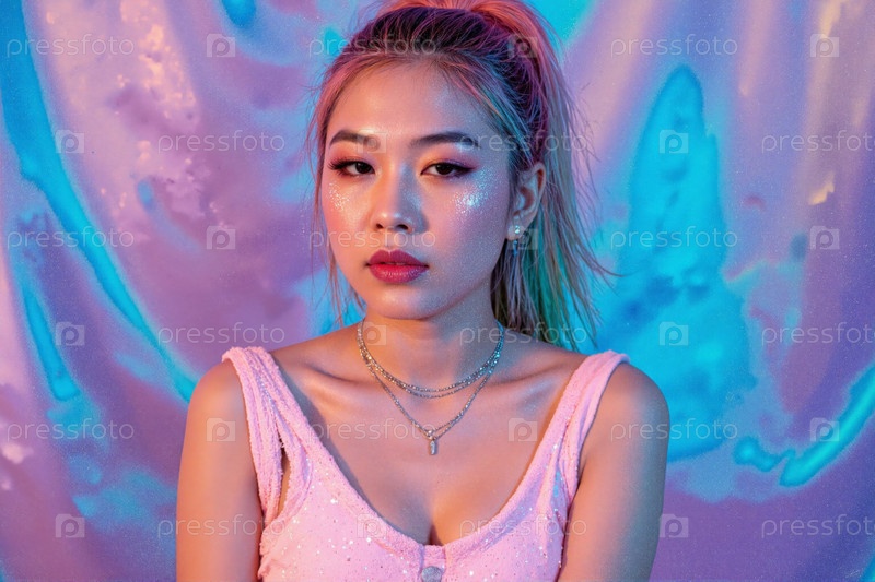 Портрет молодой взрослой азиатской женщины, позирующей на красочном радужном фоне