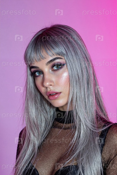 Портрет молодой взрослой женщины, смотрящей на камеру с серебряными волосами