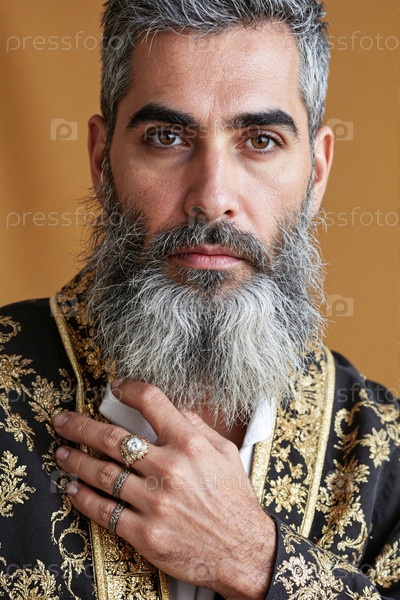 Портрет мужчины среднего возраста, носящего украшенную куртку и демонстрирующего кольца