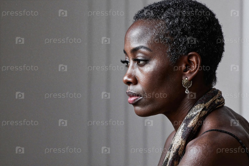 Чернокожая женщина среднего возраста, сидящая в профиле, выглядит продуманной внутри