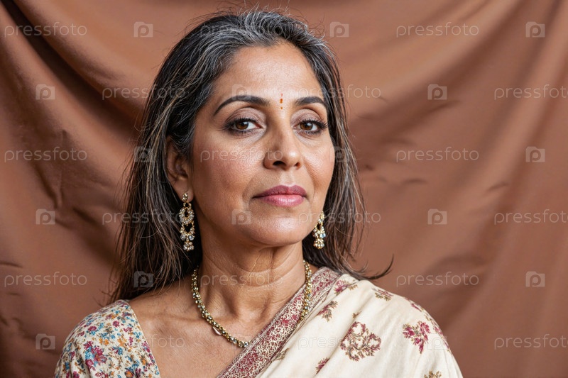Портрет южноазиатской женщины среднего возраста, которая носит украшения и слегка улыбается