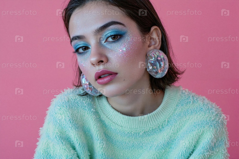 Портрет молодой женщины с блестящим макияжем, смотрящей на камеру