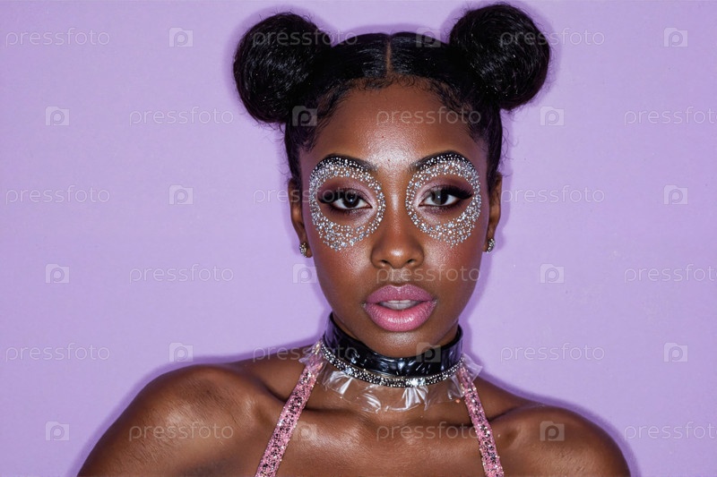 Портрет молодой взрослой чернокожей женщины, носящей блестящий макияж и смотрящей на камеру