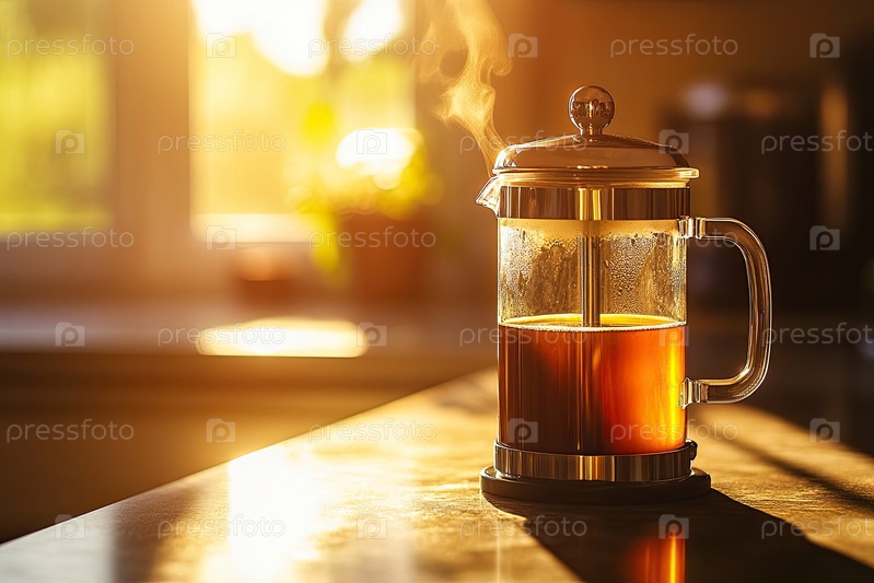 Французский пресс заваривает свежий кофе на солнечной кухне во время утреннего восхода солнца