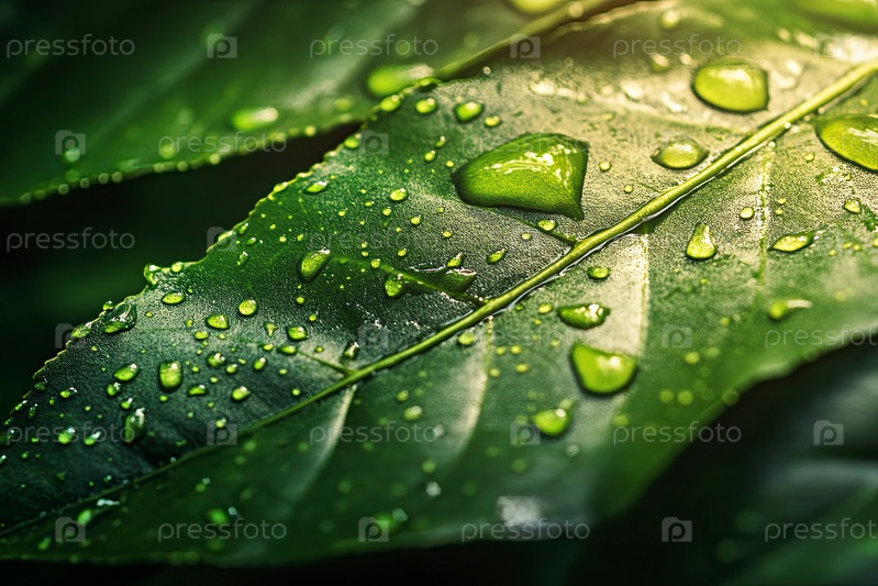 Ближайшее изображение листья кофейного растения, показывающее капли воды, отражающие солнечный свет