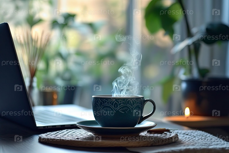 Кофейная чашка с паром, стоящая на столе возле ноутбука в уютной домашней обстановке