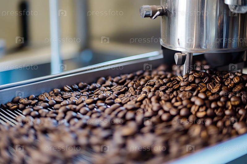 Свежежатые кофейные бобы охлаждаются после обжарки в промышленной машине