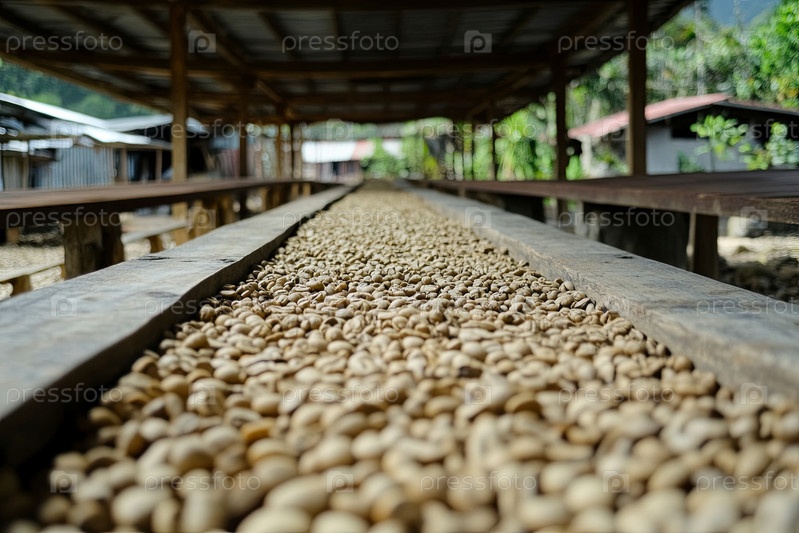 Кофейные бобы сушат на деревянных стойках в помещении для наружной обработки