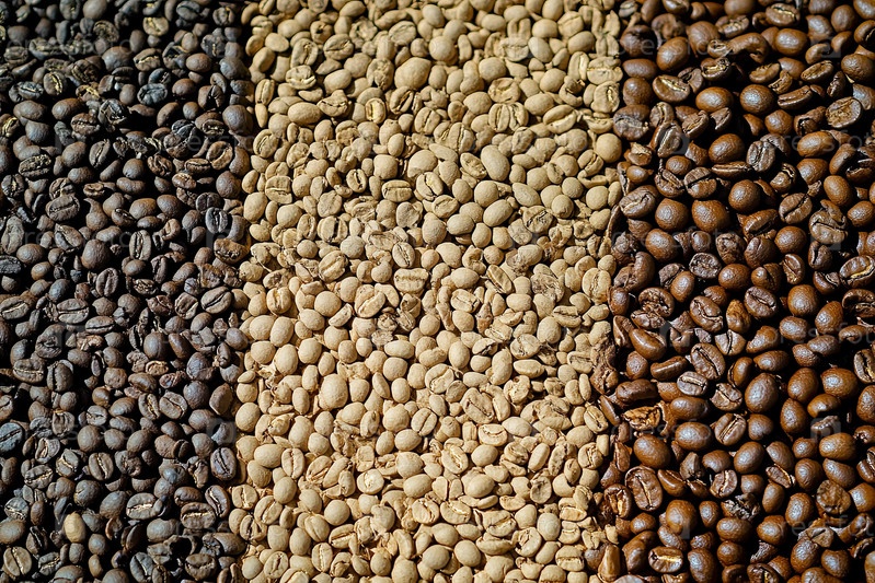 Сортированные кофейные бобы, отображающие различные стадии обжарки в ближайшем просмотре
