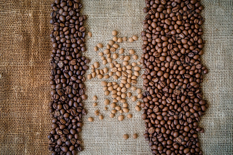 Сортированные кофейные бобы расположены на поверхности бурлапа, представляющей культуру кофе