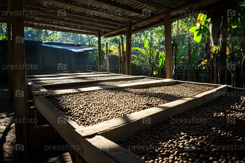 Сушка кофейных бобов на деревянных стойках На улице в условиях сельской плантации