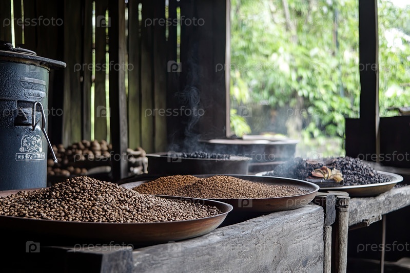 Жареные кофейные бобы парят на деревянном столе в рустической наружной обстановке