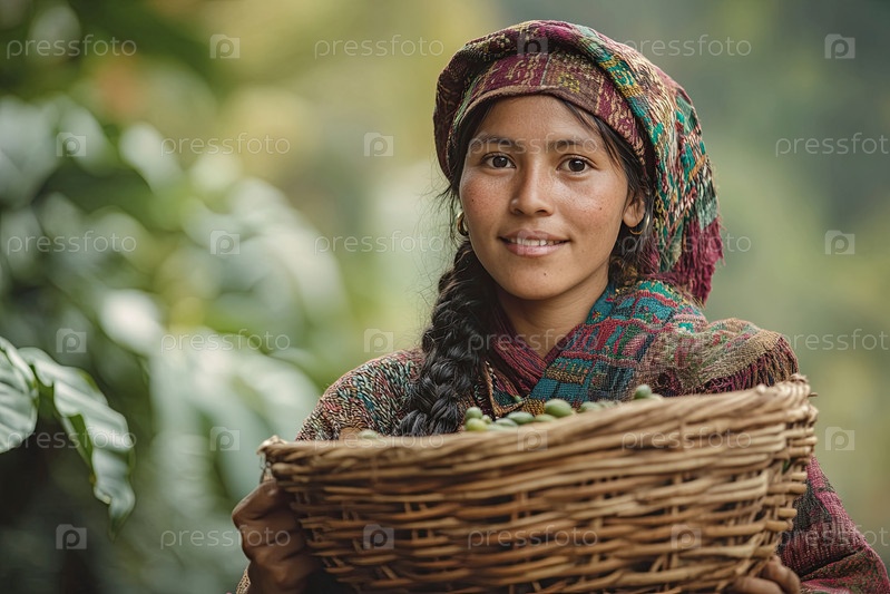 Портрет молодой взрослой индейской женщины, держащей корзину и собирающей кофейные бобы