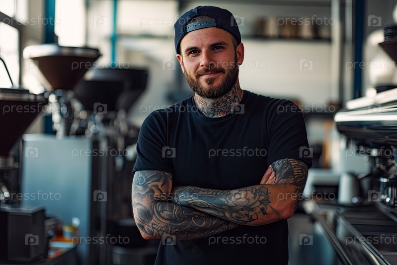 Портрет молодого взрослого человека, стоящего в кофейне и улыбающегося