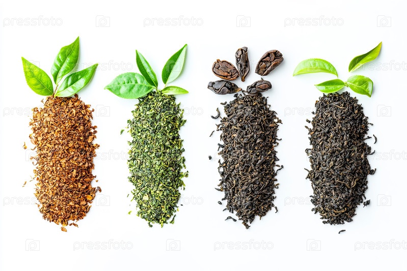 assorted Loose Leaf Tea Varieties Arranged with Fresh Leaves on Background Различные сорта чая с свободными листьями, расположенные на свежем фоне