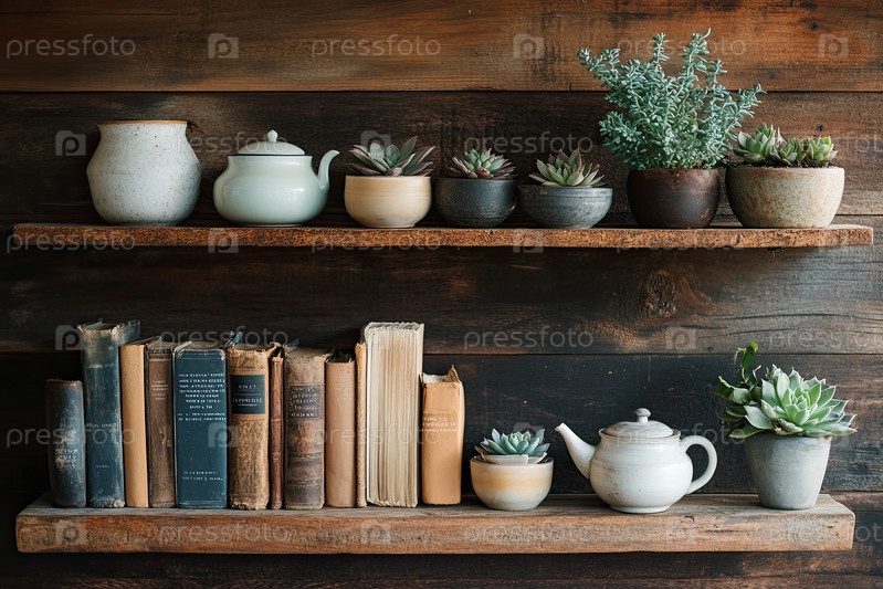 Керамический чайник и сочные растения, расположенные на деревянной полке с винтажными книгами
