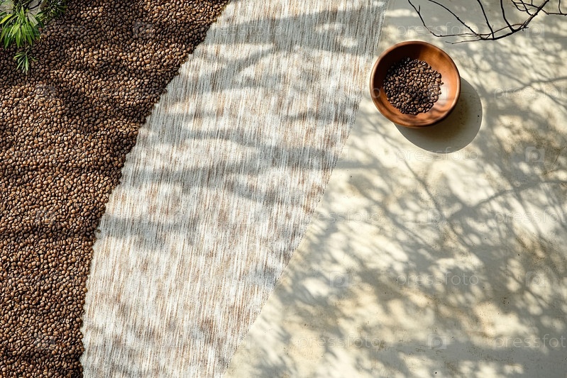 Кофейные бобы разбросаны по поверхности с деревянной чашей, подчеркивающей культуру кофе